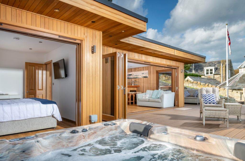 Incorporate a gazebo area into your bespoke garden room design to accommodate a hot tub or swim spa. Drawing upon elements of our Buckingham Garden Room, we customise a covered outdoor space as part of your unique build.